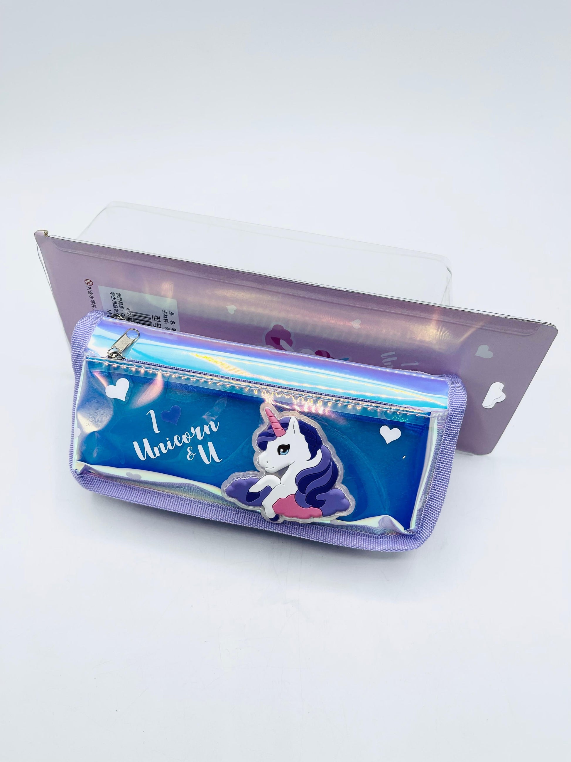 Each case features a glossy, holographic finish with vibrant blue and pastel accents, adorned with a playful unicorn illustration and the phrase “I ♥ Unicorn & U.”